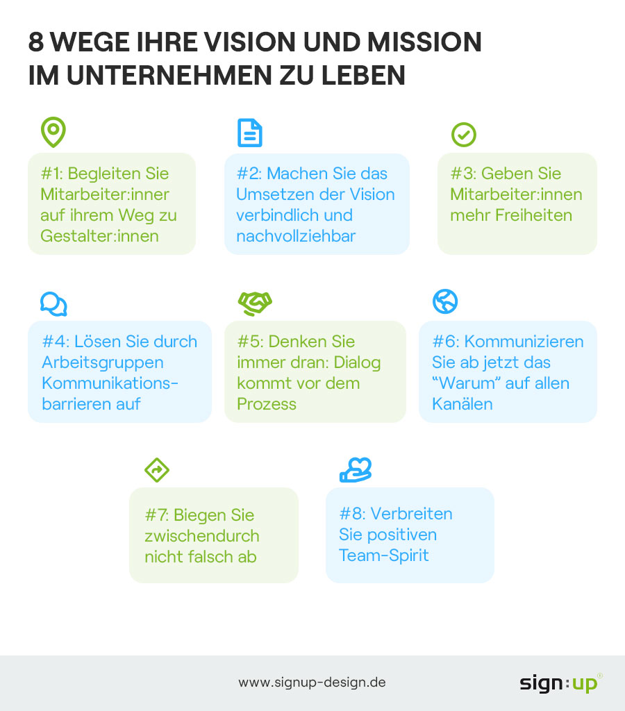 Begeisterung ist ansteckend. Machen Sie deutlich, welche Einstellung Sie vertreten. Das gilt auch für das positive Denken rund um die Einführung einer Mission und Vision. Sie sind als Führungskraft oder Geschäftsführung ein großes Vorbild und dürfen sich zur Vision des Unternehmens öffentlich äußern. Leben Sie selbst die definierten Werte vor und schaffen Sie Anreize für alle anderen, die ihr Verhalten ebenfalls im Sinn des Unternehmenszwecks verändern wollen.