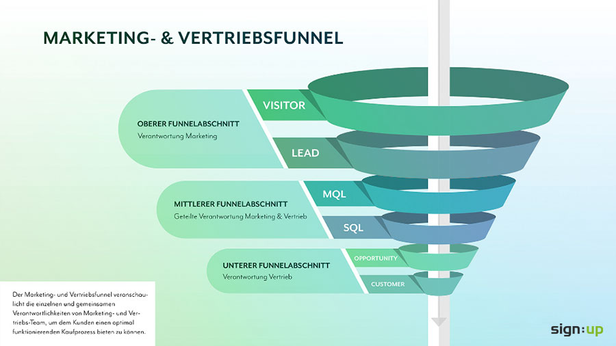 Wann ist das Marketing zuständig und ab welcher Phase übernimmt der Vertrieb? Wie hoch ist die Anzahl an Leads, die das Marketing dem Vertrieb übergeben soll und wie viel Umsatz soll der Vertrieb aus diesen Leads generieren? Je mehr Details vorab geklärt sind, desto besser.