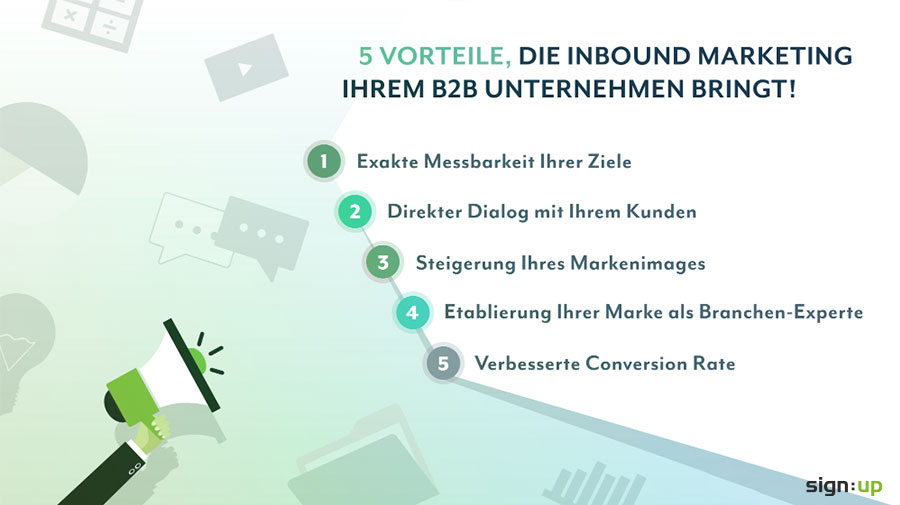 Höhere Conversion Rates, direkte und zielgerichtete Kundenansprache, optimierte Geschäftsprozesse, verbesserte Kundenbindung und eine gestärkte Markenidentität sind nur einige Vorteile, die Inbound Marketing mit sich bringt.